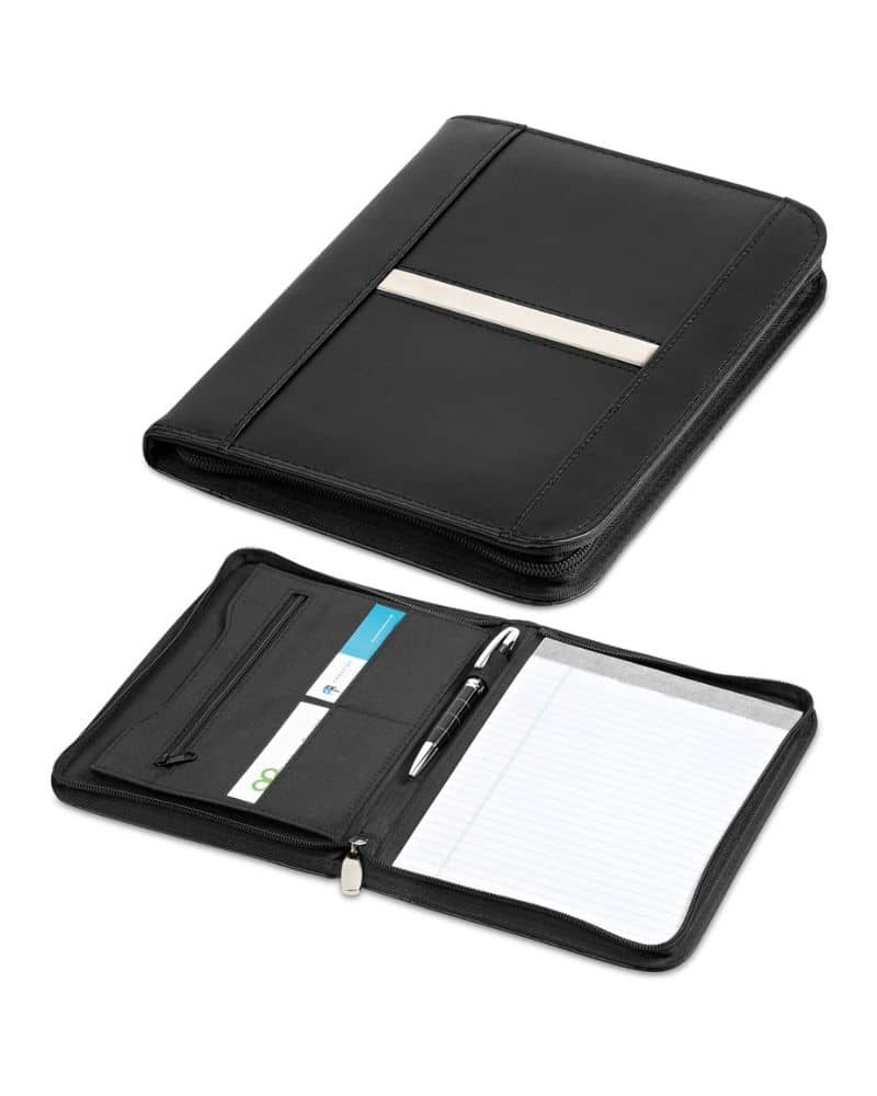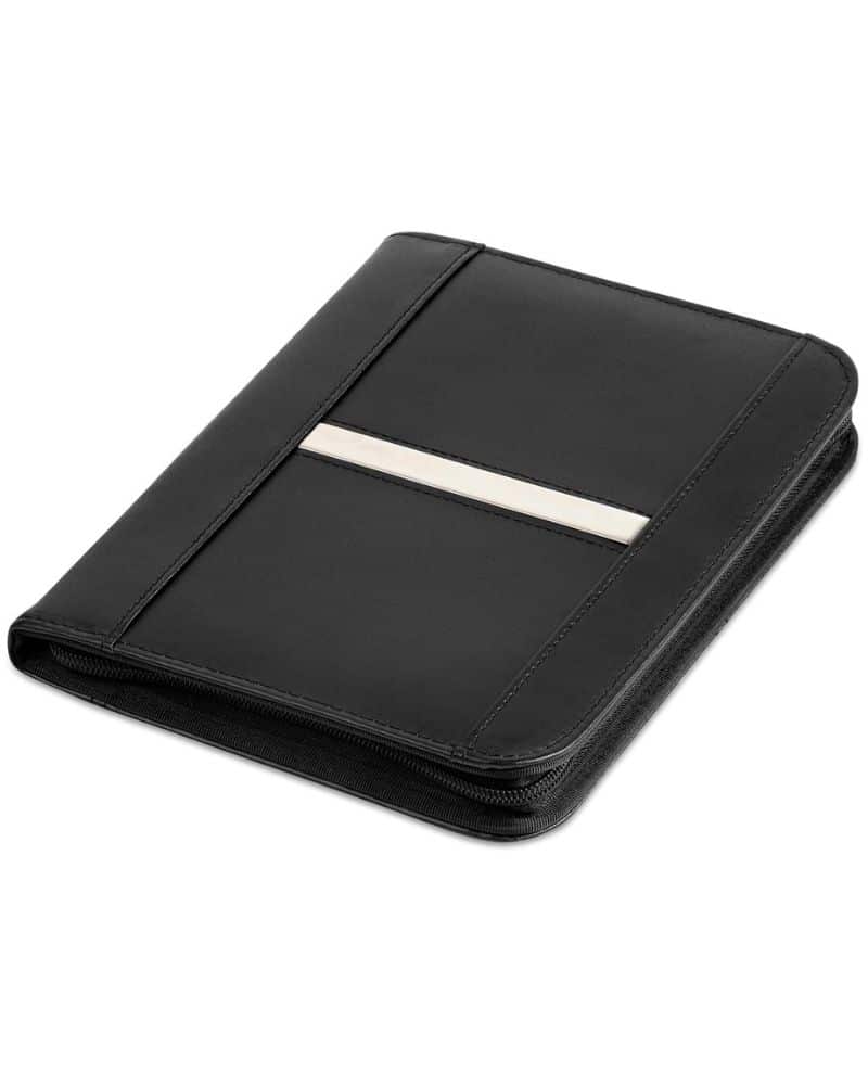 Made predominantly from bonded leather, this compact A5 zip-around folder features a metal plate inset on the cover, which can be laser engraved.