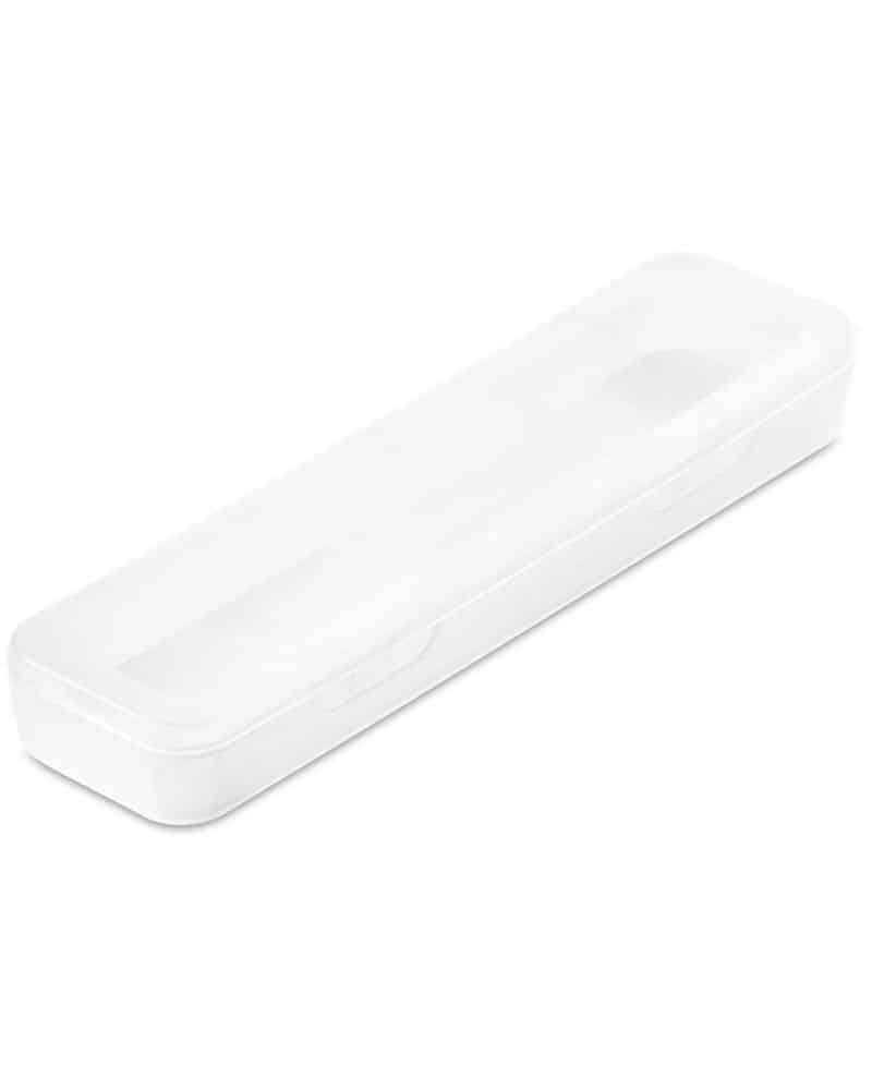 Transparent . Can fit a slim pen, pencil, 15cm ruler , eraser and sharpener. Available only when combined with 2 or more stationery items from this catalog. Not a stand-alone item.