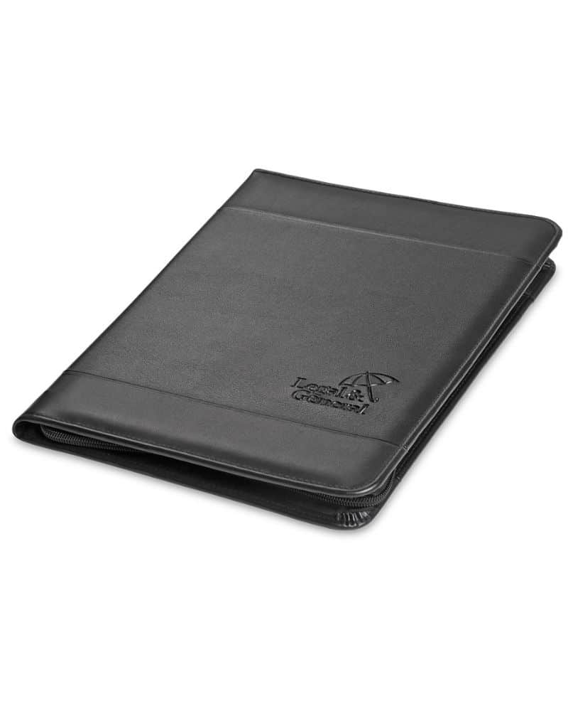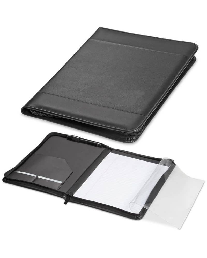 his zip-around folder has a pebble grain PU surface on the outside and features a document slot, 2 card slots and a pen loop on the inside.