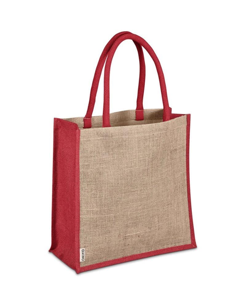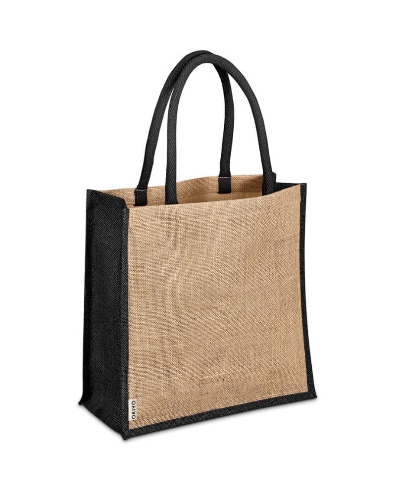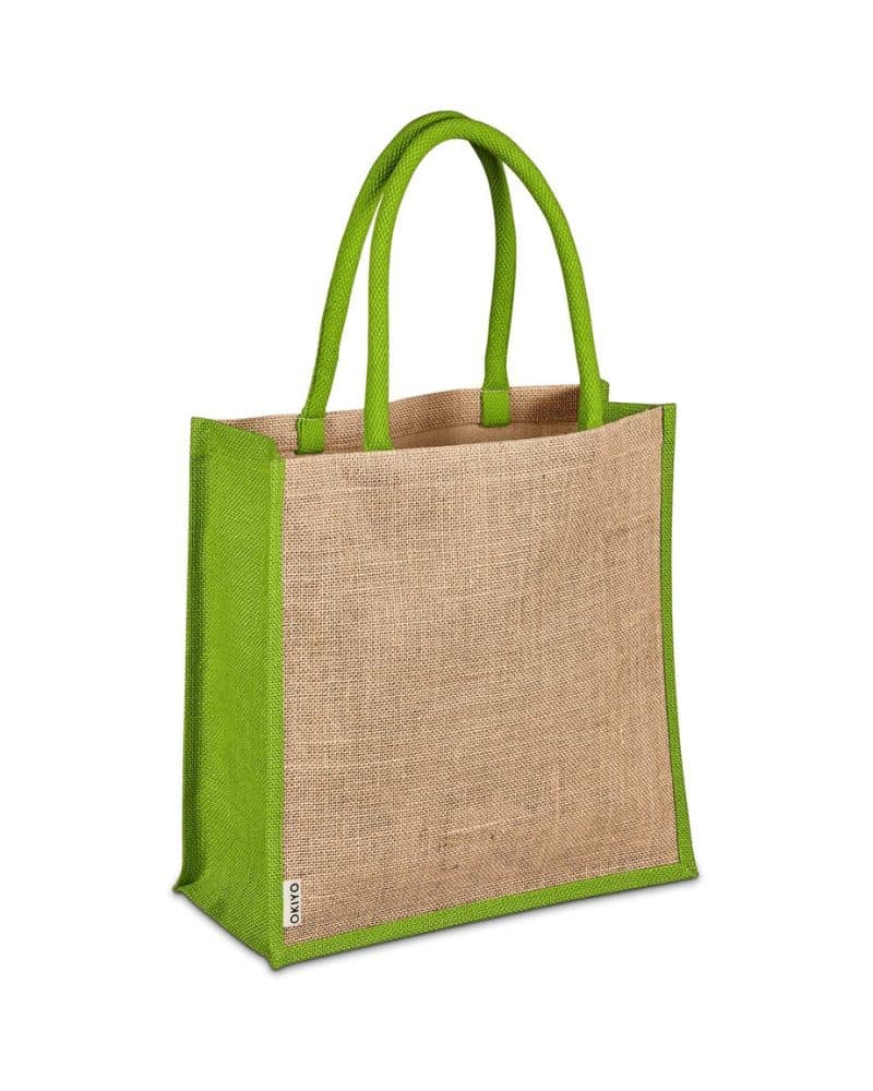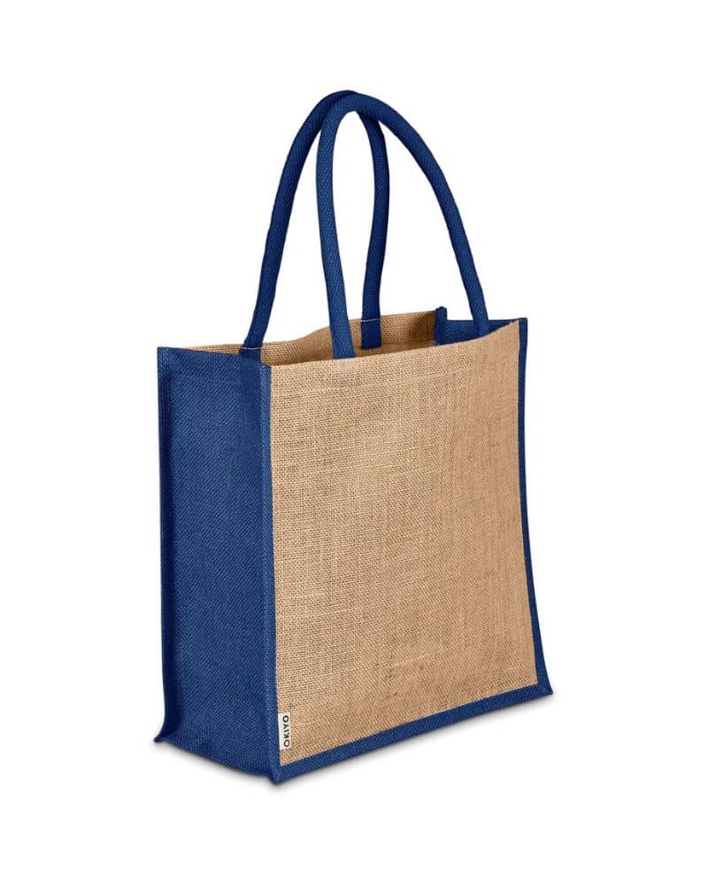 Jute is a natural vegetable fibre made from the outer stem and skin of the jute plant. Harvested fibres are spun into yarn which is then used to make reusable bags and other products. The plants are easily farmed without pesticides, and grow to maturity within 6 months. The material is biodegradable and compostable. Branding of your logo or message is most effective on these bags when done in a colour to match the coloured side panels and comfortable cotton handles.