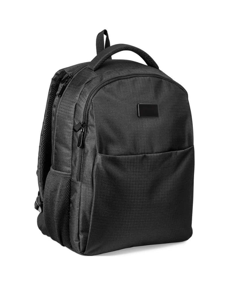 Main zippered compartment. Holds 15.6″ laptop. Front zippered compartment with organisation panel. Dual mesh side slots. Hidden back zippered pocket for additional travel safety. Padded back panel for extra comfort. Adjustable chest strap. Adjustable padded shoulder straps. Padded top carry handle. Additional grab handle. Metal branding plaque.