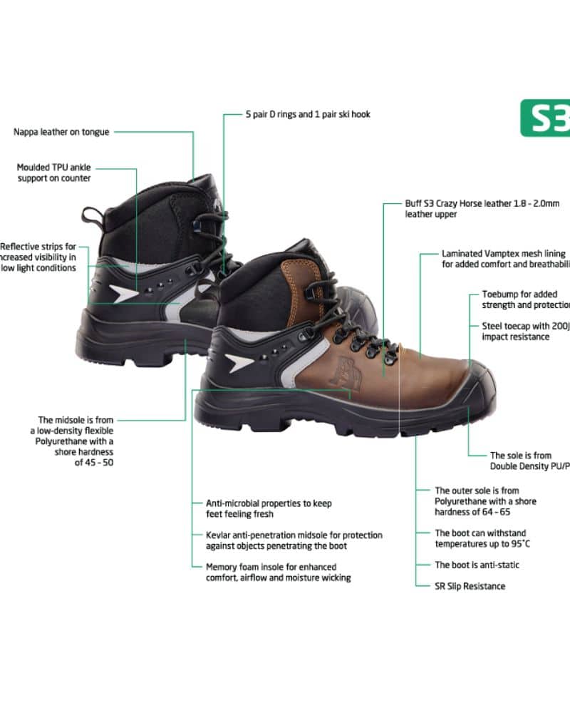 • Rated S3 with FO and PL designations for fuel‑oil resistance and penetration resistance to meet modern workplace requirements.