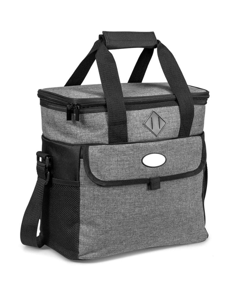 Elegant with beautiful black and grey contrast. Holds up to 24 cans. Main zippered compartment with PEVA lining. Front pocket with flap. Side mesh pocket. Double reinforced handles with Velcro handle wrap. Adjustable shoulder strap. Recessed plaque for domed sticker application attached to cooler.